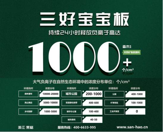 三好宝宝板材环保、时尚、舒适。不仅具有坚韧细腻的材质、稳定的结构、耐磨耐腐等优点,而且从细节上最大程度地还原了纯木自然沉稳的纹理风貌和温润饱满的触感质地,既满足了消费者对健康环保产品的需求,又能保证家居美观度。而三好宝宝板拳头产品负离子抗菌板材,更是持续24小时释放负离子每立方厘米1000+,利于人体健康和室内空气的净化,在家中就能享受到置身森林的清新感觉。